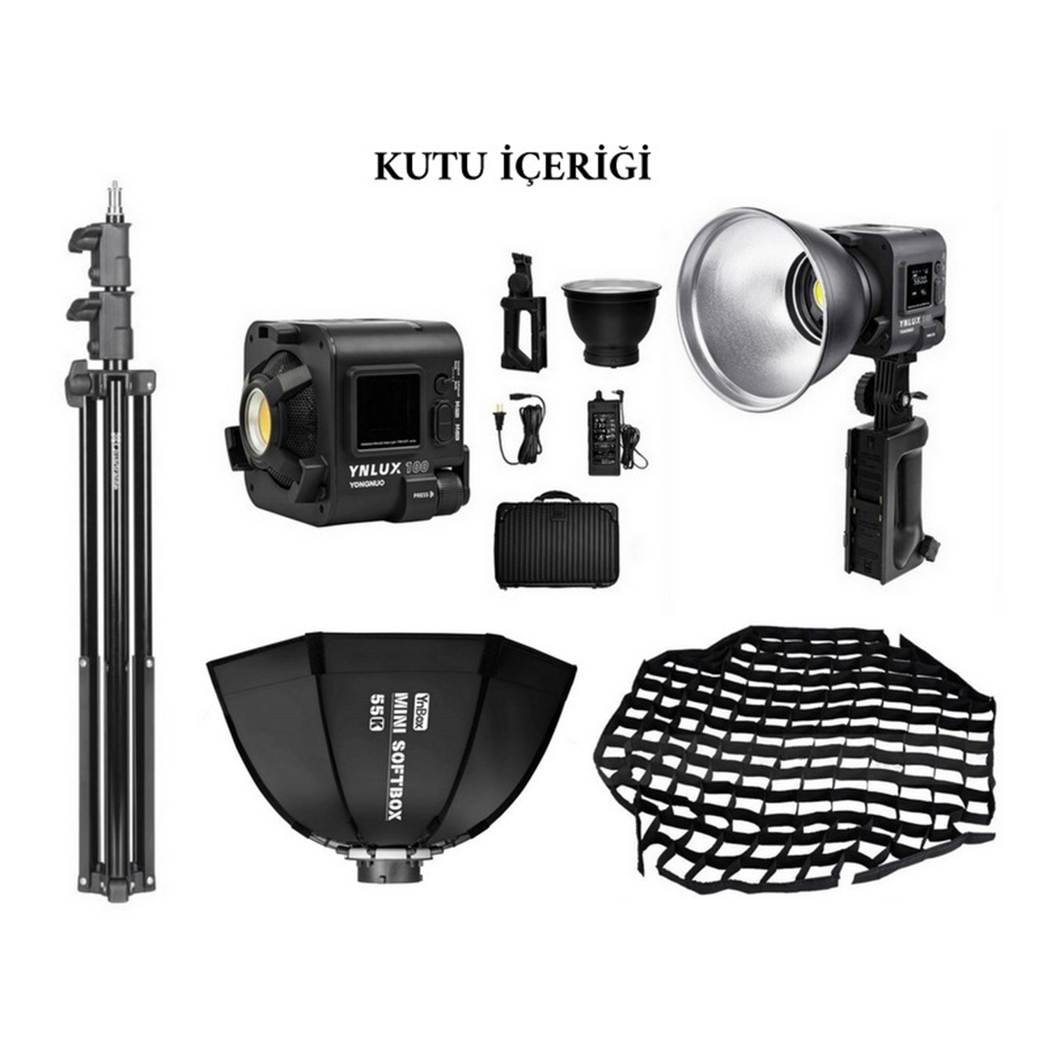 Kutu İçeriği1 * YNLUX100 RGB LED Işık 1 * AC Adaptör 1 * Güç Kablosu 1 * Tas Reflektör 1 * NP-F Batarya Handle 1 * Taşıma Çantası 1 * 55K Softbox 2 * Beyaz Difüzör Kumaşı (iç ve dış) 1*GS-55 Grid 1*200cm Işık Ayağı